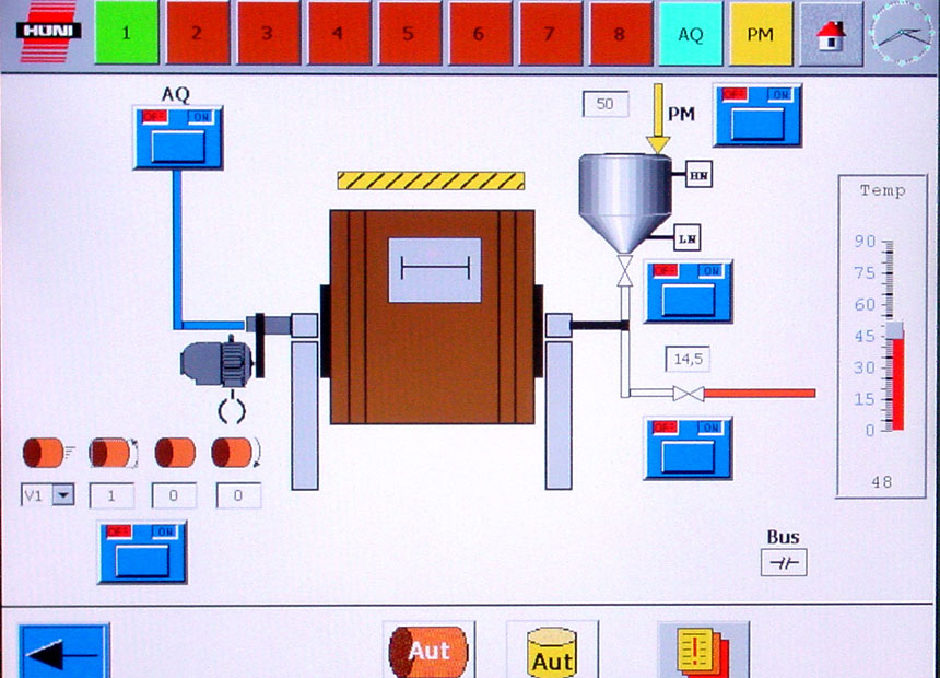 Aquamix is standalone product version located near the mixing battery. AQ is used for mixing of cold and hot water to a desired temperature and for measuring the amount of added water. Approximately the desired temperature is reached in 5-10 seconds, temperature tolerance +/- 1 °C. Touch color screen placed on cabinet allows to control and to supervise the system. AQ is easily extendible for control of water addition to any number of drums (Standard 8 … 16 drums). Easily exchangeable PLC in case of a system failure. Software which can be extended with additional features to AQUAMIX/PRODODOS and any number of satellites.